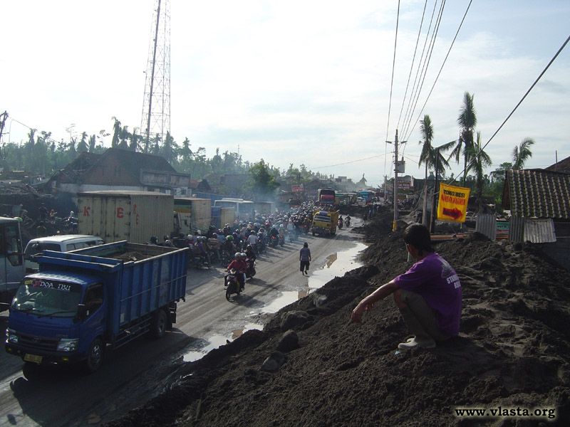 K největšímu buddhistickému chrámovému komplexu v Indonésii, k Borobudur, jedu na mopedu z asi 45 kilometrů vzdálené Yogyakarty. Půjčení mopedu stojí 50 000 IDR. Cestou projíždím místem, kde pracují na odstranění závalu bahna a lávy po nedávné erupci.