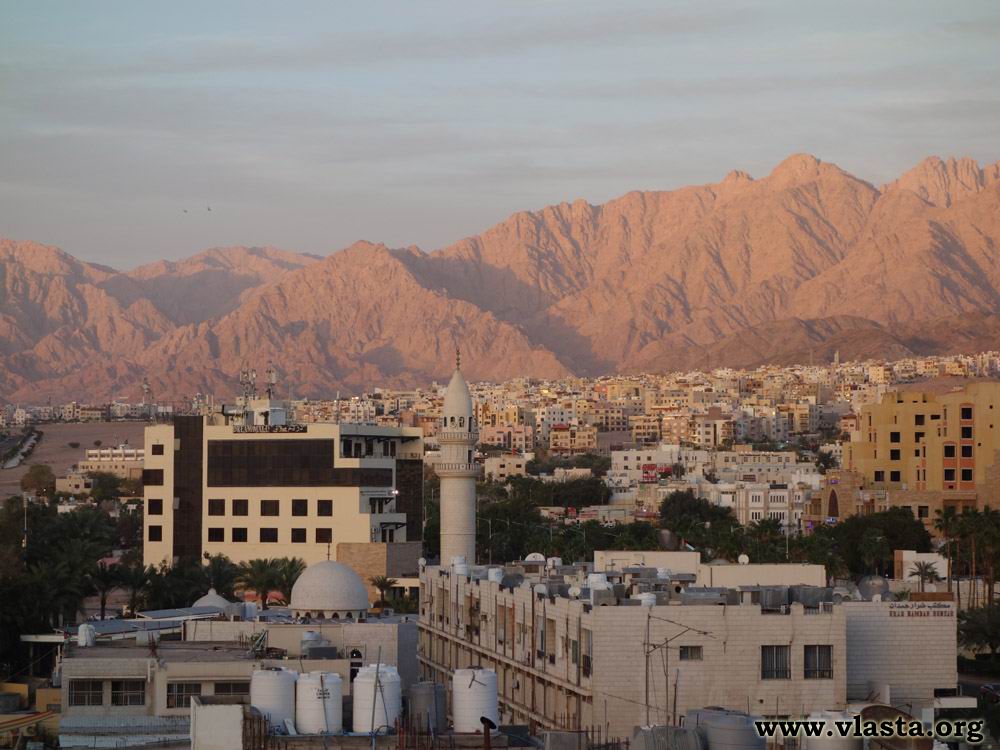 Akaba - jediný přístav celého Jordánska je naší vstupní branou do Jordánaska. Právě zde pěšky překračujeme hranici z Izraele. Akaba leží na břehu Rudého moře. Tento důležitý přístav je propojen dálnicí s hlavním městem Ammán. Od hraničního přechodu nás odváží autobus jordánské přepravní společnosti. Pěšky by to do centra bylo přes 7 kilometrů. V samotném městě máme nyní jen krátkou zastávku. Opět se sem vracíme večer před návratem do Izraele. Ubytovaní jsme v hotelu Mina v centru města.