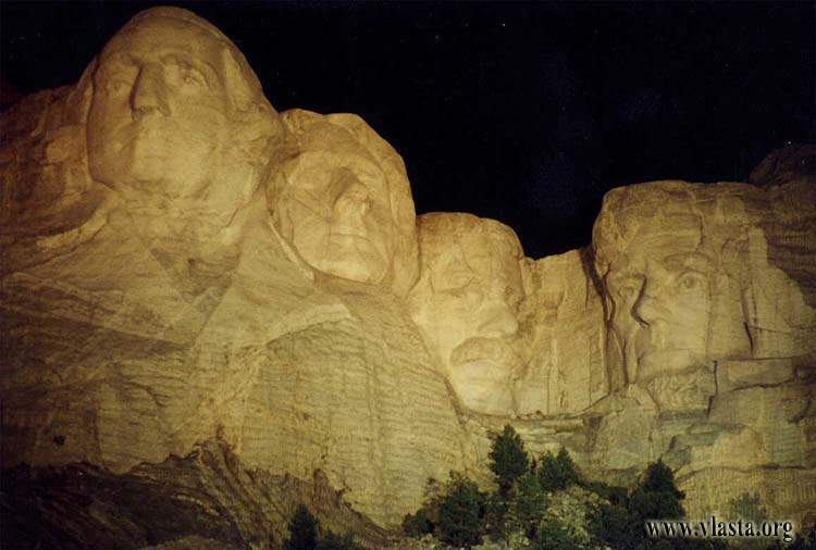 Mount Rushmore - ve skále vytesané hlavy čtyř prezidentů USA: G. Washington, - tvůrce kabinetního systému, federálního bankovního systému .T. Jefferson - hlavní autor Konstituce a Deklarace nezávislosti. Také se zasloužil o koupi Louisiana. A. Lincoln - morální integrita, rozšířil svobodu pro všechny občany USA i za cenu Občanské války. T. Roosevelt - zajistil Panamský průplav, vedoucí roli USA ve světě, celkový růst země.
