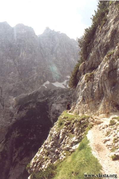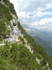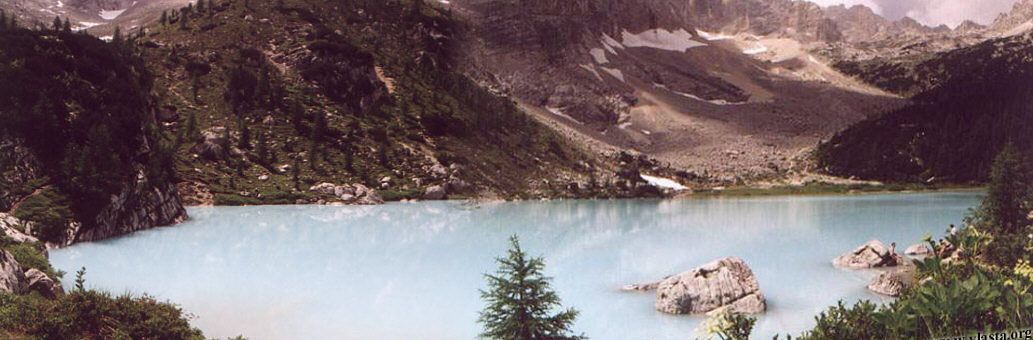 Hned na počátku stezky #215 začínající v Passo Tre Croci (1791m) potkávám Čechy z autobusu, které jsem potkal i předešlého dne. Dá se říct, že celou trasu absolvuji s nimi. Stezka z počátku vede lesem a má vodorovný profil. V poslední části před jezerem Lago del Sorapis vede po hraně prudkého srázu hlubokého kolem 400 metrů. Pleso Lago del Sorapis(1 923m) mělo neuvěřitelnou blankytně modrou barvu. Zde si děláme polední pauzu. Bohužel později to tu vypadalo jako na Vaclaváku. Dorazilo několik dětských skupinek...
