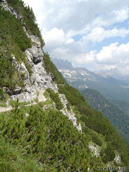 Vracíme se po stezce #216, která začíná prudkým stoupáním do 2 243m a po krátkém klesání dosahuje svého vrcholu v Forc. Marcuoira (2 307m). Odtud je nádherný pohled na masiv M. Cristalo (3 221m) a Crepe de Zumeles (2 230m). Odtud krátce ale prudce klesáme a po chvilce se napojujeme na stezku #213. Ta vede skrze nádherné paloučky uprostřed lesů ohraničených skaními stěnami. Zbytek cesty se postupně svažuje až ke "Třem křížům" alias Tre Croci.