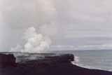 Chain of Craters Road is 30 kilometers long road that pass several lava fields and Pu'u Loa Petroglyphs - geometrické obrazce, zvířata i lidé ztvárnění v lávě. Main attraction is near "moving end of the road". "Moving" because lava often cross the road and makes it shorter. Under solid thin lava's bark is endlees stream of flowing lava. Several thousand people had driven to the end of the road and hiked the trail to see lava flowing down coastal cliffs and into the sea . Place where lava meets sea is easy to find because huge steam. If you are lucky you can see red lava flowing on the surface. I was surprised haw fast stiffening yello-red lava (1 160°C) changed it's color, shape and merges with older grey-black surface. It is very dangerous because you can not to be sure how old and cold is lava's surface. Before trip to see lava flow take a look at info.